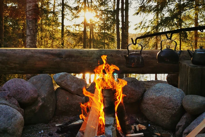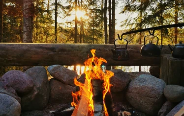 Metsäretken, vierailun karhuaitassa, nuotiopaikan, yrttijuoman ja siemennäkkärin (L,GL)